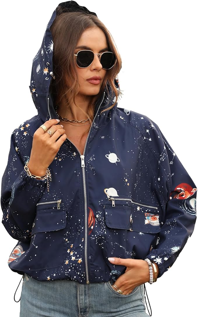 Women's Space Theme Casual Jackets Windbreaker Zip Up Long Sleeve Cropped Oversized Utility Anorak Coat with Hood