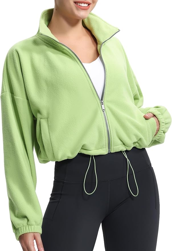 Women's Fleece Cropped Jacket Full Zip Stand Collar Workout Short Sherpa Coats with Pockets Drawstring Hem